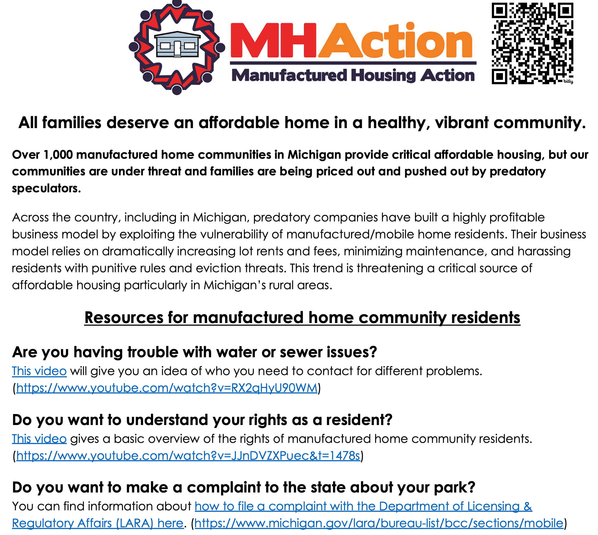 Are you a manufactured home resident in Michigan? Here are some useful resources, including where to go when dealing with water issues, how to get legal assistance, how to find your local representatives, and where to file complaints.